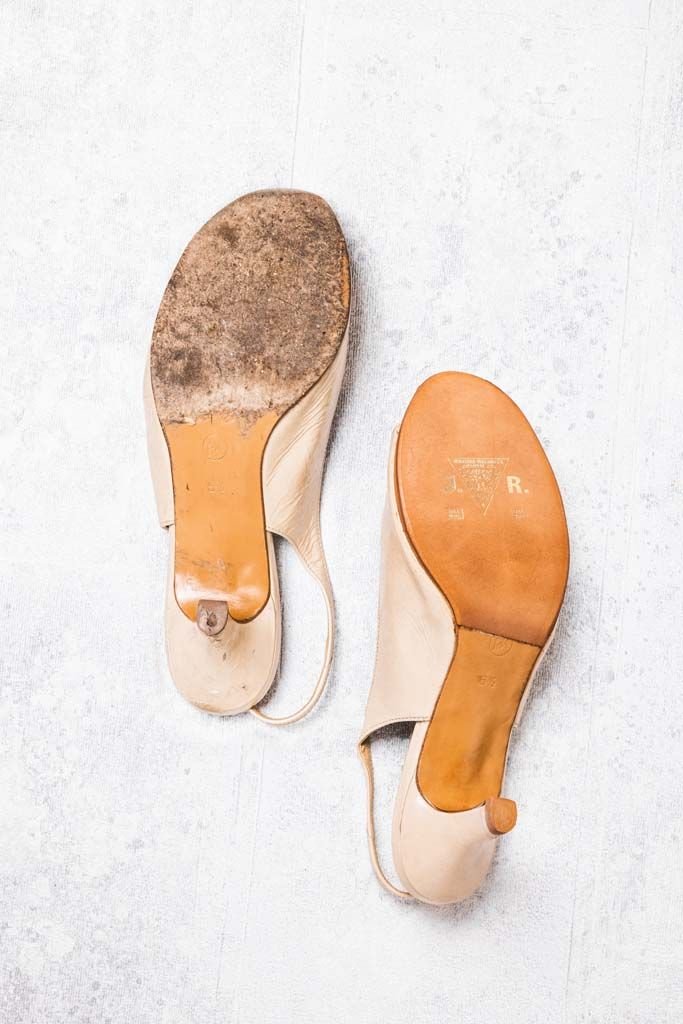 Als erster Schritt werden sowohl die alte Sohle als auch der abgelaufene Absatz vorsichtig, aber umso sorgfältiger abgeschliffen und restlos entfernt.